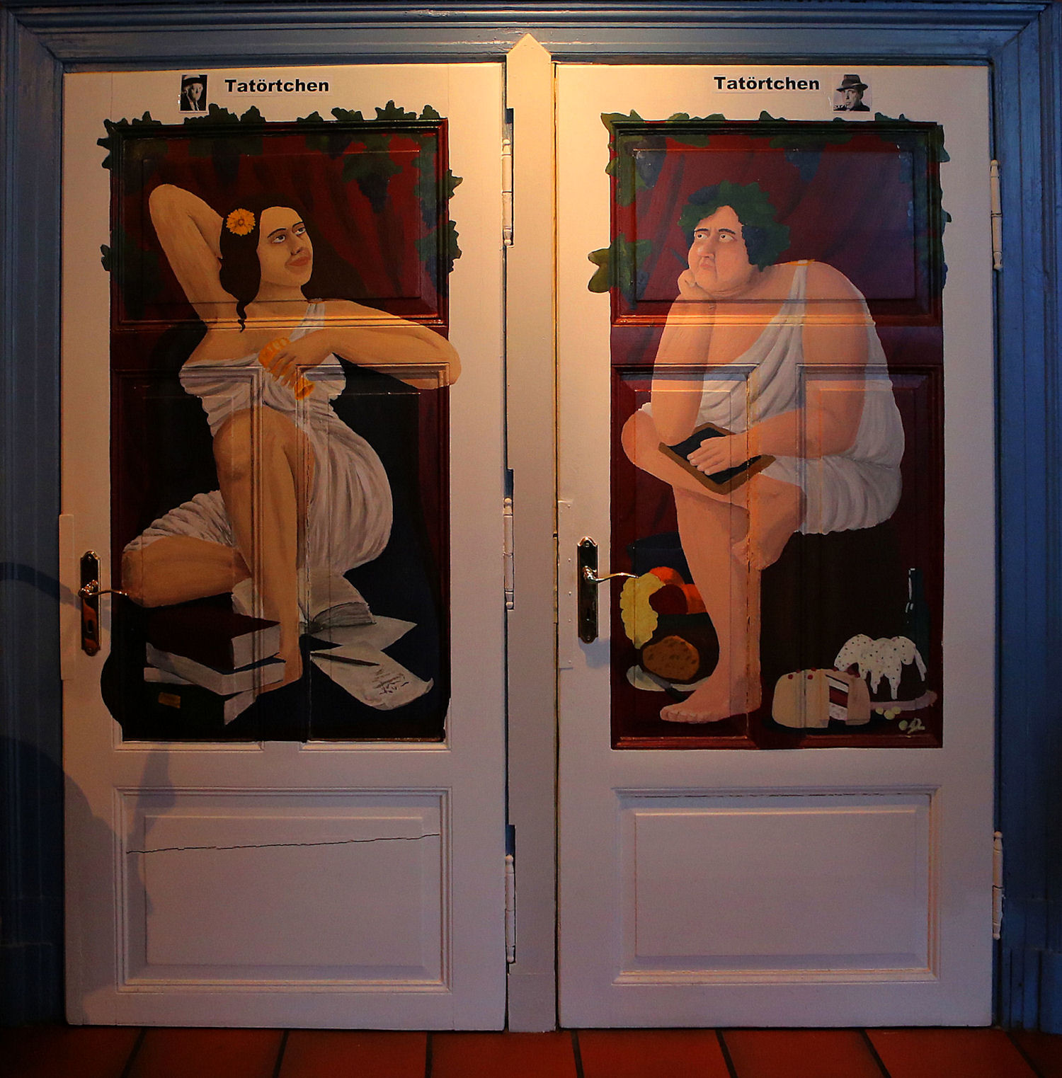 De toiletdeuren van het etablissement waren prachtig beschilderd.