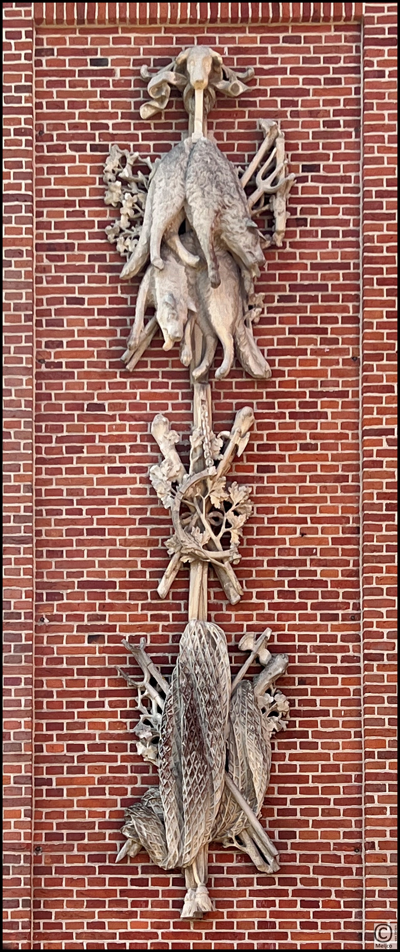 Aan de buitenzijde van het hoofdgebouw hangen versierselen in de vorm van jachttrofeeën. Bovenaan de wolven.